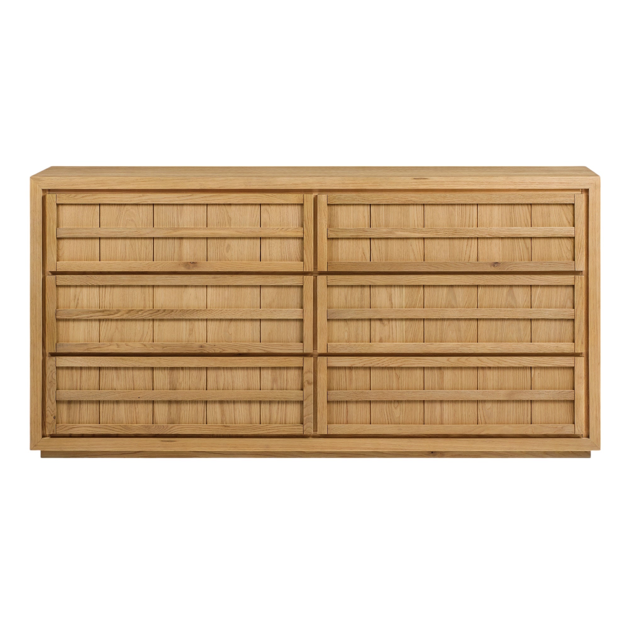 The Buddy dresser combines the beauty of natural oak wood with a textured finish achieved through a wire brushing technique that showcases the depth and character of the wood grain.