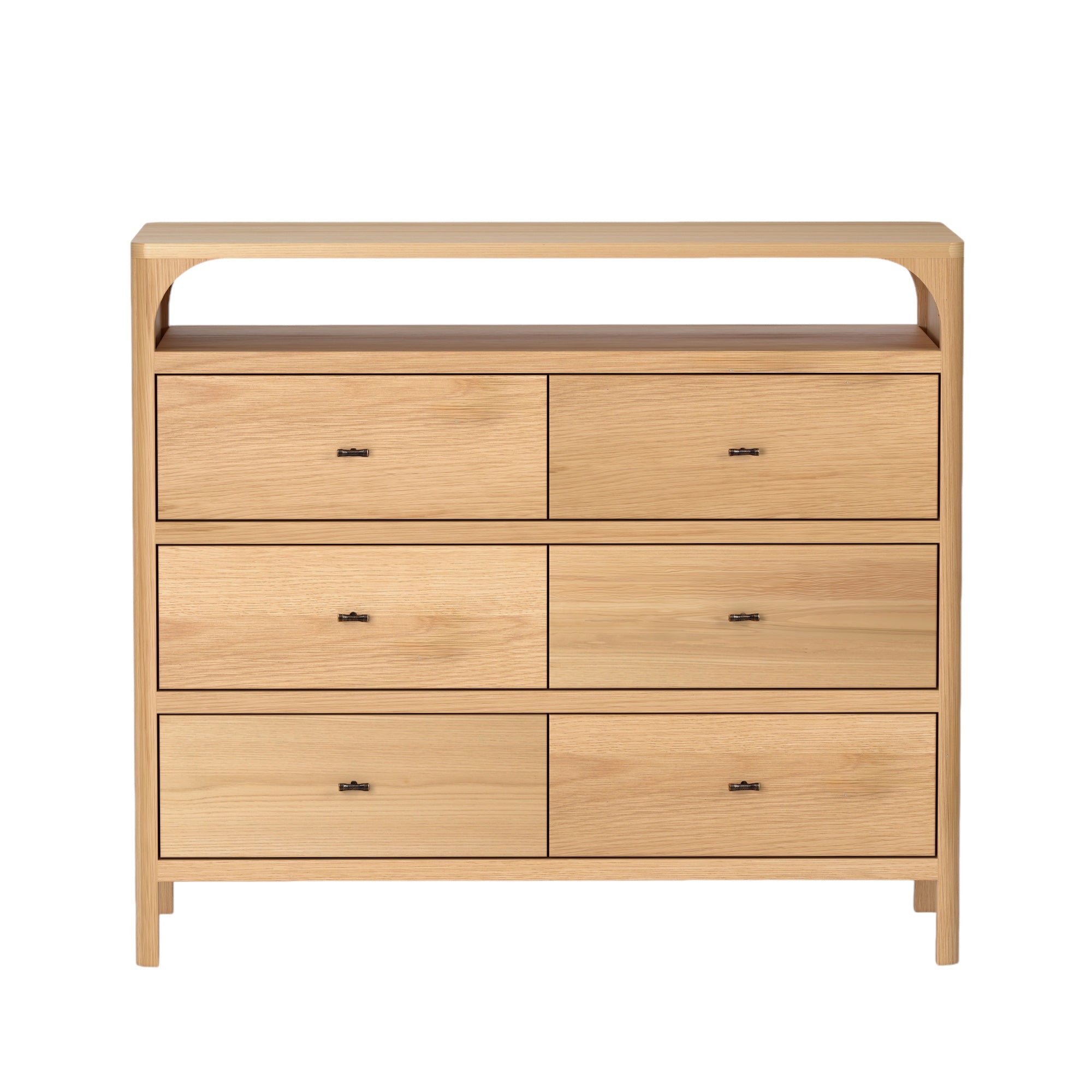 The open storage incorporates an arch detail, and allows you to keep your essentials within reach, or to display decorative objects. The antique bronze finished hardware and soft close drawer runners add to the heirloom quality of the piece. The 6-drawers provide ample storage for clothing, while the compact dimensions make this ideal for apartments and smaller spaces.